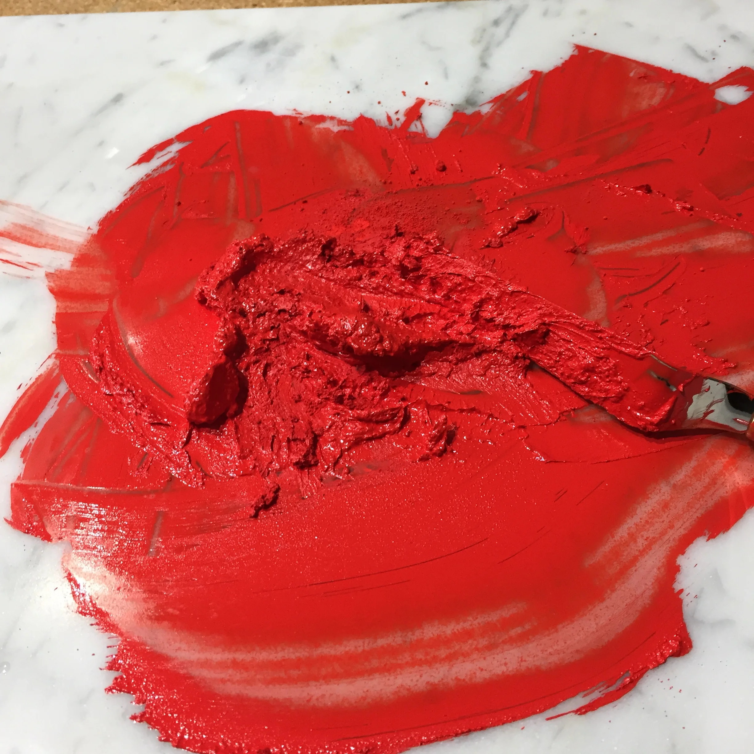 Making paint is simple and the time required, once you find the palette you like to use, is usually less than the time spent shopping for materials. The process is simple, but there is a learning curve to get just the right consistency for painting. The dry pigment is slowly mixed with Walnut Oil and blended thoroughly to wet all of the pigment. I mix on a marble tile, which I purchased and a stone/tile supplier as a remnant. Once the pigment and oil are blending, begin mulling small amount of the mixture to a smooth consistency. This is where you start to see the final viscosity of your paint. Fine tuning to get the desired consistency can be altered by adding more pigment or walnut oil and mulling.